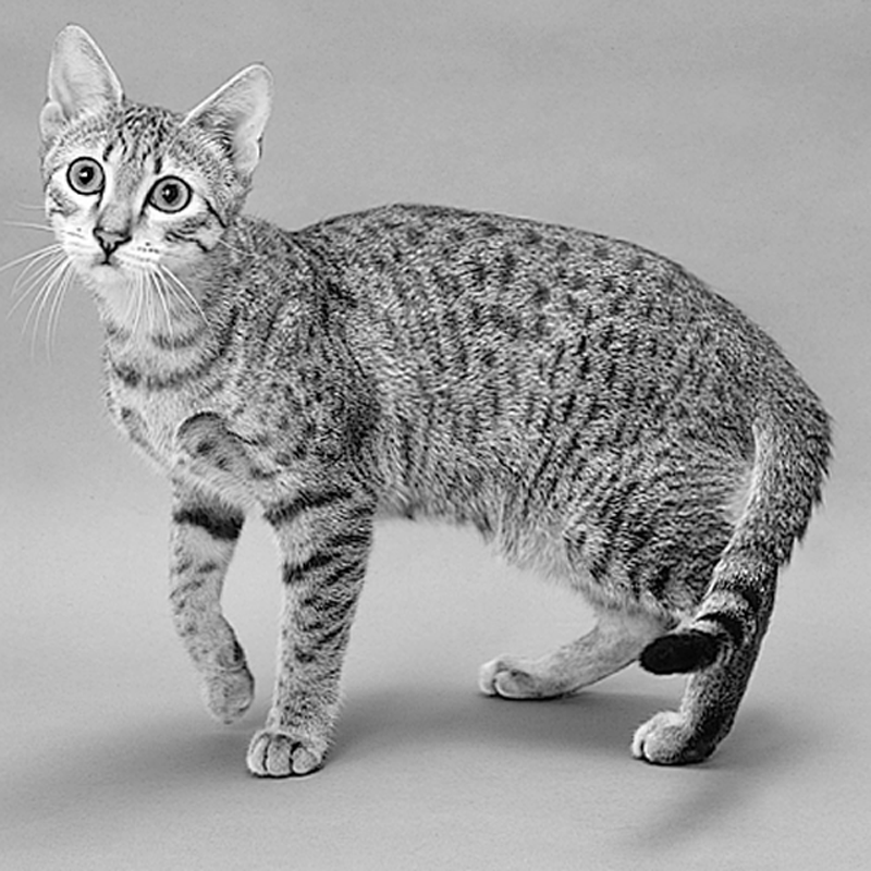 〔動〕エジプシャン=マウ《エジプト原産のネコから1950年代に米国で作られたアーモンド型をした緑色の目をもつネコ》.