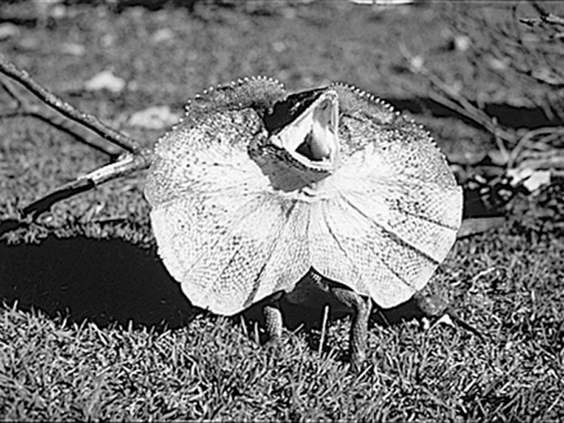 〔動〕エリマキトカゲ(Chlamydosaurus kingii)《オーストラリア北部に生息するアガマ科のトカゲ》.