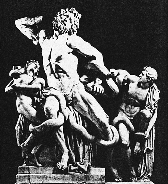 【名】〔ギリシア神話〕ラオコーン《トロイのアポロン神殿の神官;木馬の引き入れに反対したため息子2人と共に2匹の大蛇に絞め殺された》.