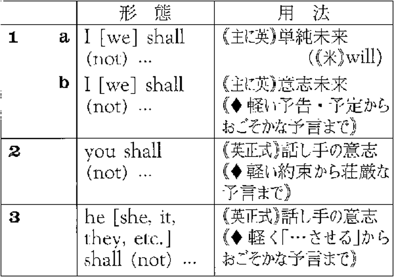 )《◆(1)縮約形:'ll. (2)((古))では二人称単数現在形は(thou) shalt, 同過去形は(thou) shouldst. (3)否定は通例 shall not を用い, 縮約形の shan't