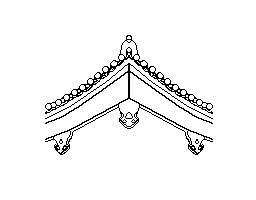 (2)破風板(ハフイタ)・垂木など傾斜した二材の合う所。合掌した手の先のような形なのでいう。