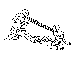 (2)二人で,輪にしたひもを互いの首にかけ,引っ張り合う遊び。くびっぴき。