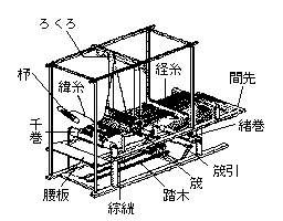 手織り機の一。腰板に腰掛け,足で踏み木を踏んで綜絖(ソウコウ)を上下させて織るもの。躄(イザリ)機から改良され,構造全体が高い。棚機。大和機(ヤマトバタ)。