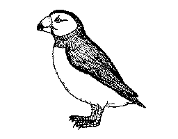 チドリ目ウミスズメ科の鳥。全長35センチメートル内外。頭と背は黒,顔と腹は白い。目の上に角状の突起がある。くちばしは大きく縦に平たい。アラスカから千島列島など太平洋北部寒流域に分布。