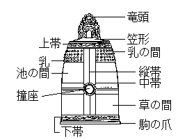 寺院の鐘楼の釣り鐘。青銅製が多く,撞木(シユモク)で打ち鳴らす。洪鐘・蒲牢(ホロウ)・鯨鐘・巨鯨・華鯨・長鯨など多くの異名がある。