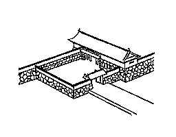城の入り口の形式の一。城門の内側に L 字形の城壁を設け,あいている辺に城門を構え,曲輪(クルワ)内にはいるのに二つの門を通るようにしたもの。多く外には高麗(コウライ)門,内には櫓(ヤグラ)門が設けられる。