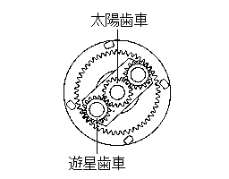 二種の歯車をかみ合わせ,おのおのの軸をつないで,一つの歯車のまわりを他がかみ合いながら回るようにした歯車装置。かみ合いながら回る歯車を遊星歯車,中心になる方を太陽歯車という。自動車の差動歯車装置などに用いられる。