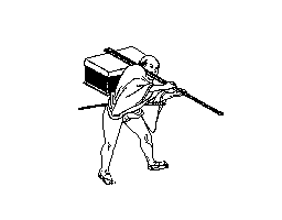 (2)衣服などを持ち運ぶときに,二枚の板で上下からおおった上を竹ではさんで,担いだもの。