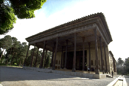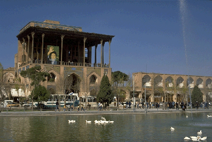 イラン中部,海抜1580メートルの高原にあるオアシス都市。サファビー朝の首都。香水や銀細工,カーペットなどの手工芸品を産する。一一世紀後半創建の大モスクは,セルジューク朝からサファビー朝までのイラン建築の様式が随所にみられる。エスファハン。