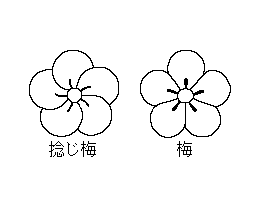 うめ [0] 【梅】 〔「梅」の字音「メ」に基づいてできた語〕 (1)バラ科の落葉高木。中国原産。古く日本に入り,観賞用庭木として珍重されている。葉は卵形で先がとがり,鋸歯がある。花は早春,葉に先立って開き,白色・淡紅色の五弁または重弁で芳香がある。果実は球形の核果で酸味が強く,梅干しや梅酒とする。未熟時に生食すると中毒することがある。[季]春。《二もとの―に遅速を愛すかな/蕪村》 (2)梅の果実。 (3)家紋の一。梅の花を図案化したもの。 (4)「梅襲(ウメガサネ)」に同じ。 〔中古以降「むめ」と表記されることが多い〕 梅(3) [図]
