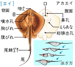 エイ目の軟骨魚類の総称。体は扁平で、ひし形ないし円形をし、尾は細長い。目は背面にあり、口とえらあなとは腹面に開く。えらあなは五対または六対ある。大部分は海産であるが淡水にすむものもある。卵生、または卵胎生。世界に約三五〇種、日本近海にはアカエイ・イトマキエイ・シビレエイなど約五〇種が分布《季 夏》