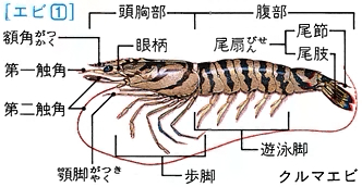 十脚目長尾亜目の甲殻類の総称。海水または淡水にすむ。体は頭胸部と腹部に区別される。頭胸部は一枚の甲殻で覆われ、二対の触角、五対の歩脚をもつ。腹部は七節からなり、五対の遊泳脚がある。歩行するイセエビ・ザリガニ、遊泳するクルマエビ・サクラエビ・シバエビなどがある。食用、魚類のえさとして重要。