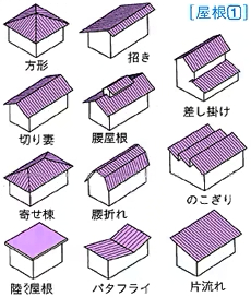 [下接語]板屋根・大屋根・瓦(かわら)屋根・切妻屋根・草屋根・腰折れ屋根・越し屋根・小屋根・晒(さら)し屋根・取り葺(ぶ)き屋根・鋸(のこぎり)屋根・丸屋根・マンサード屋根・陸(ろく)屋根・藁(わら)屋根