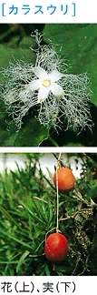 ウリ科の蔓性(つるせい)の多年草。山野に生え、巻きひげで他に絡みつく。葉は手のひら状に浅く裂ける。雌雄異株。夏の夕方、花びらの縁が糸状に裂けた白い花をつけ、実は楕円形で赤く熟す。塊根からとるでんぷんは天瓜粉(てんかふん)の代用。たまずさ。《季 秋》「紅(くれなゐ)もかくては淋し―/蓼太」