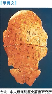 《「文」は文字の意》占いの記録のためにカメの甲や獣類の骨に刻まれた中国最古の文字。多く殷墟(いんきよ)から出土。図像的要素の強い原始文字で、漢字の原形となる。甲骨文字。