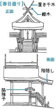 神社本殿形式の一。切妻造り・妻入りで、正面に階隠(はしかく)しをつけ、棟には置き千木(ちぎ)・鰹木(かつおぎ)を置く。奈良時代に完成したものという。春日大社本殿がその代表例。