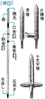 長い柄の先に細長い剣(穂)をつけた武器。鎌倉末期からもっぱら戦場で用い、室町末期には道具と称して、これを重んじた。穂の形により、素槍・鎌槍・十文字槍・鉤(かぎ)槍などがある。「―をしごく」