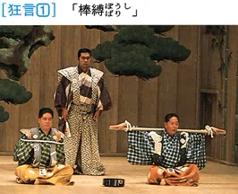 日本の古典芸能の一。猿楽のこっけいな物真似(ものまね)の要素が洗練されて、室町時代に成立したせりふ劇。同じ猿楽から生まれた能に対する。江戸時代には大蔵・和泉(いずみ)・鷺(さぎ)の三流があったが、鷺流は明治末期に廃絶した。本狂言と間(あい)狂言に大別される。能狂言。