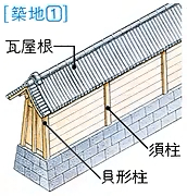 柱を立て、板を芯として両側を土で塗り固め、屋根を瓦で葺(ふ)いた塀。古くは、土だけをつき固めた土塀。築地塀。築垣(つきがき)。