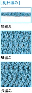 手編みの技法の一。鉤針一本を用いて編み地を編み出していく手法。鎖編み・細編(こまあ)み・長編みなどがある。