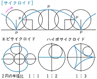 円が一直線上または曲線上を滑ることなく転がるとき、この円の円周上に固定された一点が描く曲線。円が他の円の外周を転がるときにできる曲線をエピサイクロイド、内側に接して転がるときにできる曲線をハイポサイクロイドという。