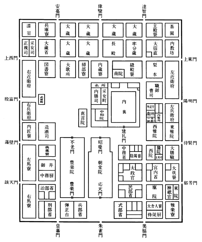 複数辞典一括検索+- (非使用)広辞苑大辞林新辞林大辞泉古語NHK 日本語発音アクセント辞典日国明鏡国語辞典新明解漢字源必携類類義使分大シ英辞郎研究社新英和大辞典ジーニアス英和大辞典ことわざ- (非使用)広辞苑大辞林新辞林大辞泉古語NHK 日本語発音アクセント辞典日国明鏡国語辞典新明解漢字源必携類類義使分大シ英辞郎研究社新英和大辞典ジーニアス英和大辞典ことわざ- (非使用)広辞苑大辞林新辞林大辞泉古語NHK 日本語発音アクセント辞典日国明鏡国語辞典新明解漢字源必携類類義使分大シ英辞郎研究社新英和大辞典ジーニアス英和大辞典ことわざだい‐だいり【大内裏】🔗⭐🔉だい‐だいり【大内裏】 (タイダイリとも)皇居である内裏を中心として、その周囲に政務や儀式を行う朝堂院ちょうどういん、諸官庁などを配置した一郭。大化改新以後、官制の整備に伴って拡充。平城京・平安京では京の北端中央に位置した。宮城。宮。→内裏(図) 大内裏 広辞苑 ページ 11874 での【大内裏】単語。
