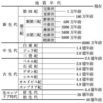 複数辞典一括検索+- (非使用)広辞苑大辞林新辞林大辞泉古語NHK 日本語発音アクセント辞典日国明鏡国語辞典新明解漢字源必携類類義使分大シ英辞郎研究社新英和大辞典ジーニアス英和大辞典ことわざ- (非使用)広辞苑大辞林新辞林大辞泉古語NHK 日本語発音アクセント辞典日国明鏡国語辞典新明解漢字源必携類類義使分大シ英辞郎研究社新英和大辞典ジーニアス英和大辞典ことわざ- (非使用)広辞苑大辞林新辞林大辞泉古語NHK 日本語発音アクセント辞典日国明鏡国語辞典新明解漢字源必携類類義使分大シ英辞郎研究社新英和大辞典ジーニアス英和大辞典ことわざちしつ‐ねんだい【地質年代】🔗⭐🔉ちしつ‐ねんだい【地質年代】 地層や岩石の生成に関連して考えられる時間の流れ。今から何年前かで表す放射年代(絶対年代)と、地層・岩石の新旧を重なりかたや化石で区分した相対年代との2種がある。相対年代は、古い方から先カンブリア時代・古生代・中生代・新生代と大別され、代はさらに紀・世・期に細分。 地質年代(表) 新生代 中生代 古生代 先カンブリア時代 第四紀 第三紀 白亜紀 ジュラ紀 三畳紀 ペルム紀 石炭紀 デボン紀 シルル紀 オルドビス紀 カンブリア紀 原生代 始生代 完新世 更新世 鮮新世 中新世 漸新世 始新世 暁新世 ⇒ち‐しつ【地質】 広辞苑 ページ 12616 での【地質年代】単語。