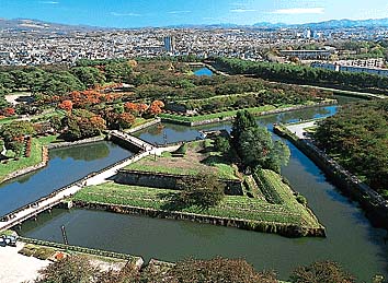 (五角形の平面をもつ洋式城塞の意)江戸幕府が北方警備の箱館奉行庁舎として建造した城郭。1864年(元治1)完成。68〜69年(明治1〜2)榎本武揚たけあき・大鳥圭介ら旧幕軍がここに拠って、新政府軍に最後の抵抗を行なった。国特別史跡。→箱館戦争