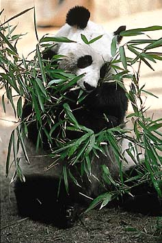 ネコ目クマ科の哺乳類で、1属1種。頭胴長1.5〜2メートル、尾長20センチメートルほど。毛色は白で、目の周囲、耳、肩から前肢、後肢は黒、腹はやや茶褐色を帯びる。中国四川省など、きわめて限られた地域に生息。1869年に、初めて存在が報告された。毛皮が美しく、動作も愛らしいので珍重されるが、生息数が少ない上に、主食をササ・タケだけに依存しているため、増殖が難しく、絶滅の恐れがある。野生での生息数は千数百頭とされる。オオパンダ。大熊猫。