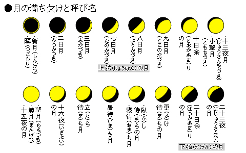 地球の唯一の衛星。太陽の光を受けて、夜輝いて見える。約二七・三日で地球を一周。太陽と地球に対する位置関係によって、目に映る形は新月・上弦・満月・下弦の満ち欠けをくり返す。