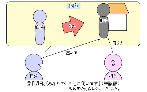 謙譲語は、自分(=話し手や文章の書き手)または自分側の人物から他人に向かう動作・ものごとについて、それが及ぶ人物を高めていう語である。謙譲語によって高めることができる人物(=他人)には、以下の三種類がある。