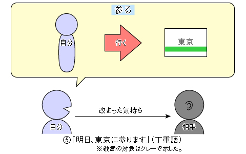 丁重語は、自分(=話し手や文章の書き手)または自分側の人物の動作・ものごとなどについて、相手(=話の聞き手や文章の読み手)に対して改まった気持ちを表す語である。丁重語によって敬意を示すことができる人物は、相手である(例:「明日、東京に参ります」…図