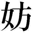 【妨】 7画 女部 [常用漢字] 区点=4324 16進=4B38 シフトJIS=9657 《常用音訓》ボウ/さまた…げる 《音読み》 ボウ(バウ)/ホウ(ハウ)〈fng・fng〉 《訓読み》 さまたげる(さまたぐ) 《意味》 {動}さまたげる(サマタグ)。たちはだかる。じゃまをする。「妨害」 「不妨=妨ゲズ」とは、さしつかえないの意。「不妨探問=探問スルヲ妨ゲズ」 《解字》 会意兼形声。方は、両側に柄の張り出たすきを描いた象形文字。妨は「女+音符方」で、手を両側に張り出してたちはだかり、女性に近づかせまいとする意を示す。 《単語家族》 防(ふせぐ)と同系。 《類義》 →禁 《熟語》 →熟語