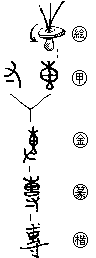 会意兼形声。上部が原字で、糸をよる重り(紡錘ボウスイ)を描いた象形文字(音セン・タン)。專はそれに寸(て)をそえた字。重りの紡錘は、何本もの原糸を一つにまとめ、かつ一か所にとどまり動揺しないので、そこから専一の意を生じた。また、まるい重りの意を含み、甎セン・磚セン(まるい石やかわら)などの原字である。