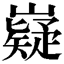 会意兼形声。疑は「子+止(あし)+音符矣アイ(人がうしろをふりかえってとまる)」の会意兼形声文字で、愛児に心引かれて足のとまるさま。凝(じっととまる)と同系。嶷は「山+音符疑」で、じっととまってそそりたつ山。
