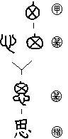 会意。上部の田は、幼児の頭に泉門のある姿。俗にいうおどりのこと。あたまを表す。思はそれと心(心臓)を合わせた字で、おもうという働きが頭脳と心臓を中心として行われることを示す。小さいすきまを通して、ひくひくとこまかく動く意を含む。