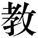 {動}おしえる(ヲシフ)。先生とでしの間に、知識を交流させること。先生からでしに、知識・経験・技術を受け渡して知らせる。また、そうして導く。「教化」「挙善而教不能=善ヲ挙ゲテアタハザルヲ教フ」〔→論語〕