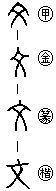 象形。もと、土器につけた縄文ジョウモンの模様のひとこまを描いたもので、こまごまとかざりたてた模様のこと。のち、模様式に描いた文字や、生活のかざりである文化などの意となる。紋の原字。