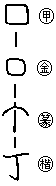 象形。甲骨・金文は特定の点、またはその一点に打ちこむくぎの頭を描いたもの。篆文テンブンはT型に書き、平面上の一点に直角にくぎをあてたさま。丁は釘テイ(くぎ)の原字。