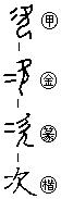 会意。「二(並べる)+欠(人が体をかがめたさま)」で、ざっと身のまわりを整理しておいて休むこと。軍隊の小休止の意。のち、物をざっと順序づけて並べる意に用い、次第に順序をあらわすことばになった。