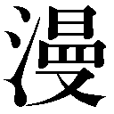 会意兼形声。曼マンは「冒の字の上部(かぶせるおおい)+目+又」の会意文字で、ながいベールを目にかぶせたさま。ながい、一面におおうなどの意を含む。漫は「水+音符曼」で、水がながながと続く、また、水が一面におおうなどの意。→曼