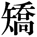 {動}まげる(マグ)。いつわる(イツハル)。まっすぐな物をわざと押し曲げる。押し曲げていつわる。むりをする。「矯命=命ヲ矯グ」「弥子、矯駕君車以出=弥子、矯ゲテ君ノ車ニ駕シテモッテ出ヅ」〔→韓非〕