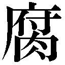 【腐】 14画 肉部 [常用漢字] 区点=4169 16進=4965 シフトJIS=9585 《常用音訓》フ/くさ…らす/くさ…る/くさ…れる 《音読み》 フ/ブ〈f〉 《訓読み》 くされる/くさらす/くさる/くちる(くつ) 《意味》 {動・形}くさる。くちる(クツ)。もと、肉の形がくずれてべったりくっつく。また、転じて、原形をとどめないようにくさる。〈類義語〉→朽→爛ラン。「腐朽」「腐肉」 {形}古くさくて役にたたない。「陳腐」「腐儒」 「腐刑フケイ」とは、刑罰の一つ。男を去勢する刑罰。宮刑。▽その傷あとがくさって、悪臭を発するので、この名がある。 「腐心」とは、心をいためること。「此臣之日夜切歯腐心也=コレ臣ノ日夜切歯腐心スルナリ」〔→史記〕 〔国〕くさる。気持ちがめいって、はればれしない。 《解字》 会意兼形声。府は、びっしりくっつけて物をしまいこむ倉。腐は「肉+音符府」で、組織がくずれてぺったりとくっついた肉。 《単語家族》 付(くっつく)と同系。 《類義》 朽は、くちて曲がる。爛ランは、どろどろにただれる。 《熟語》 →熟語 →下付・中付語