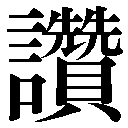 【讚】 26画 言部  区点=7613 16進=6C2D シフトJIS=E6AB 【讃】異体字異体字 22画 言部 区点=2730 16進=3B3E シフトJIS=8E5D 《音読み》 サン〈zn〉 《訓読み》 ほめる(ほむ)/たすける(たすく) 《意味》 {動・名}ほめる(ホム)。ほめたたえる。また、ほめたたえることば。〈同義語〉→賛。「画讚ガサン」 {動}たすける(タスク)。力をそろえて持ちあげる。〈同義語〉→賛{名}仏の功徳クドクをほめたたえる歌のことば。「梵讚ボンサン」 《解字》 会意兼形声。贊(=賛)は「貝(財貨)+先二つ(そろって進む)」の会意文字で、人と会見するときのおくり物をあらわす。おくり物は人にあうときのたすけになるものであることから、わきから力をあわせてたすけるの意味を生じた。讚は「言+音符贊」で、ことばをそろえて、わきからほめあげること。 《熟語》 →熟語 →下付・中付語 〈注〉熟語は→【賛】を見よ。