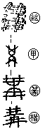 象形。冓コウは、前と後ろと同じ型に木を組んだ木組みを児童画のように描いたもの。前後左右同じ形に組んだもののこと。構(組み木)・篝コウ(組み竹)・溝コウ(両側を同じ形に組んだみぞ)などの原字。転じて、複雑精密な構造をいう。「説文解字」に、「材を交積するなり」とある。