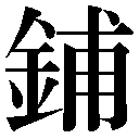 複数辞典一括検索+- (非使用)広辞苑大辞林新辞林大辞泉古語NHK 日本語発音アクセント辞典日国明鏡国語辞典新明解漢字源必携類類義使分大シ英辞郎研究社新英和大辞典ジーニアス英和大辞典ことわざ- (非使用)広辞苑大辞林新辞林大辞泉古語NHK 日本語発音アクセント辞典日国明鏡国語辞典新明解漢字源必携類類義使分大シ英辞郎研究社新英和大辞典ジーニアス英和大辞典ことわざ- (非使用)広辞苑大辞林新辞林大辞泉古語NHK 日本語発音アクセント辞典日国明鏡国語辞典新明解漢字源必携類類義使分大シ英辞郎研究社新英和大辞典ジーニアス英和大辞典ことわざ【鋪】🔗⭐🔉【鋪】 15画 金部 区点=4263 16進=4A5F シフトJIS=95DD 《音読み》 ホ/フ〈p〉 《訓読み》 しく 《意味》 {名}ぴたりと門にはりつける金具。「鋪金ホキン」 {動}しく。▽舖(たいらにしく)や布(しく)に当てた用法。 《解字》 会意兼形声。「金+音符甫ホ(ぴたりとくっつける)」。 《熟語》 →熟語 →下付・中付語 漢字源 ページ 4628 での【鋪】単語。