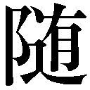 {動}したがう(シタガフ)。なるままにまかせる。また、他の者のするとおりについていく。〈類義語〉→従・→順。「随従」「付随」「夫唱婦随(夫がとなえ、妻はそのままにしたがう)」「水随方円之器=水ハ方円ノ器ニ随フ」「随山刊木=山ニ随ヒ木ヲ刊ル」〔→書経〕