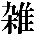 {動}まじる。まじわる(マジハル)。まじえる(マジフ)。いろいろなものがひと所に集まって入りまじる。入り乱れる。集めていっしょにする。まぜる。「雑帛ザッパク(いろいろの布)」「雑貨」「錯雑」「故先王以土与金木水火雑=故ニ先王ハ土ヲモッテ金木水火ト雑フ」〔→国語〕