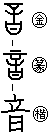 会意。言という字の口の部分の中に、・印を含ませたもの。言は、はっきりとけじめをつけたことばの発音を示す。音は、その口に何かを含み、ウーと含み声を出すことを示す。