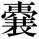 会意兼形声。嚢ノウの上部は、芯シンに棒を通し、両端と中央とをひもでしばったふくろを描いた象形文字で、東(芯を通したふくろ)の原字。嚢は「ふくろ+音符襄ニョウ・ジョウ(中に入れこむ)の略体」。